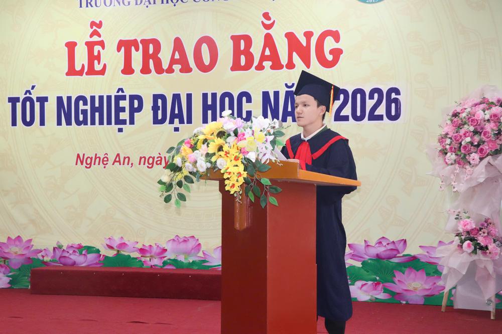 Đại diện các tân cử nhân, sinh viên Nguyễn Công Đạt – lớp K9DKTĐ đã phát biểu bày tỏ niềm xúc động và tự hào khi hoàn thành chặng đường học tập tại Trường Đại học Công nghiệp Vinh. Trong bài phát biểu, Nguyễn Công Đạt đã gửi lời tri ân sâu sắc tới Ban Giám hiệu, các thầy cô giáo, cán bộ, nhân viên Nhà trường cùng gia đình, người thân đã luôn đồng hành, hỗ trợ và tạo điều kiện để sinh viên hoàn thành chương trình học tập.
