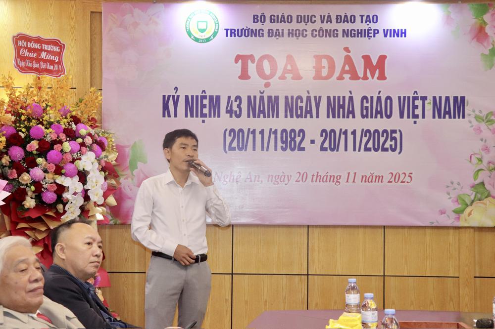 Hòa trong không khí tri ân và tôn vinh những người làm công tác giáo dục trên cả nước, sáng ngày 20/11/2025, Trường Đại học Công nghiệp Vinh long trọng tổ chức Tọa đàm chào mừng Ngày Nhà giáo Việt Nam 20/11 tại Phòng Khánh tiết Nhà trường. Đây là hoạt động thường niên giàu ý nghĩa nhằm tôn vinh đội ngũ nhà giáo và khơi dậy niềm tự hào nghề nghiệp trong mỗi cán bộ, giảng viên.