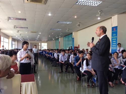 TS. David Armstrong - Chủ tịch Broward College trao đổi với các em Học sinh các trường THPT có mặt tại buổi lễ ký kết hợp tác đào tạo.