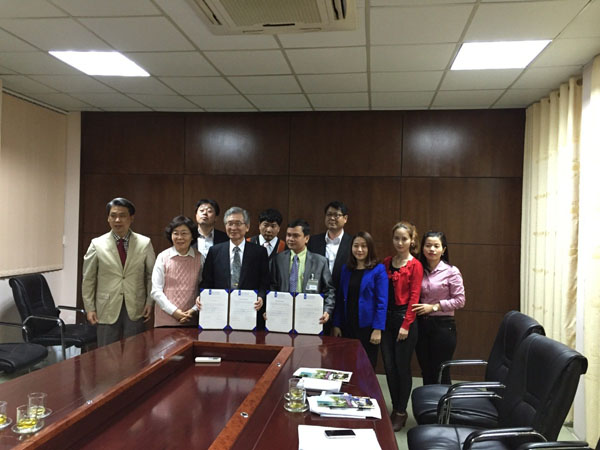 TS. Trần Đăng Thạch - Hiệu trưởng nhà trường IUV và ông Jung Ky u Nam hiệu trưởng Kwangshin (thứ 3 bên phải sang) cùng các thành viên của hai trường