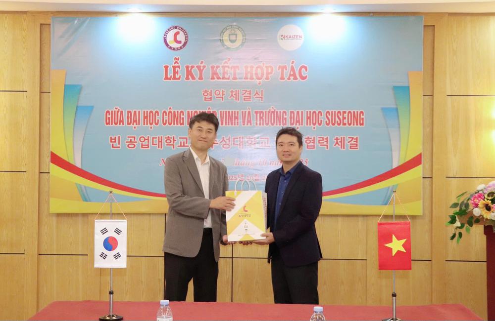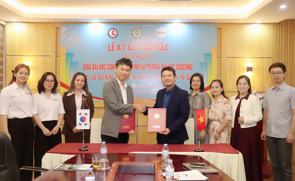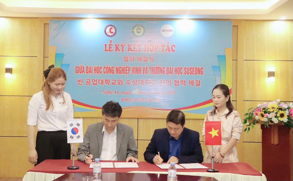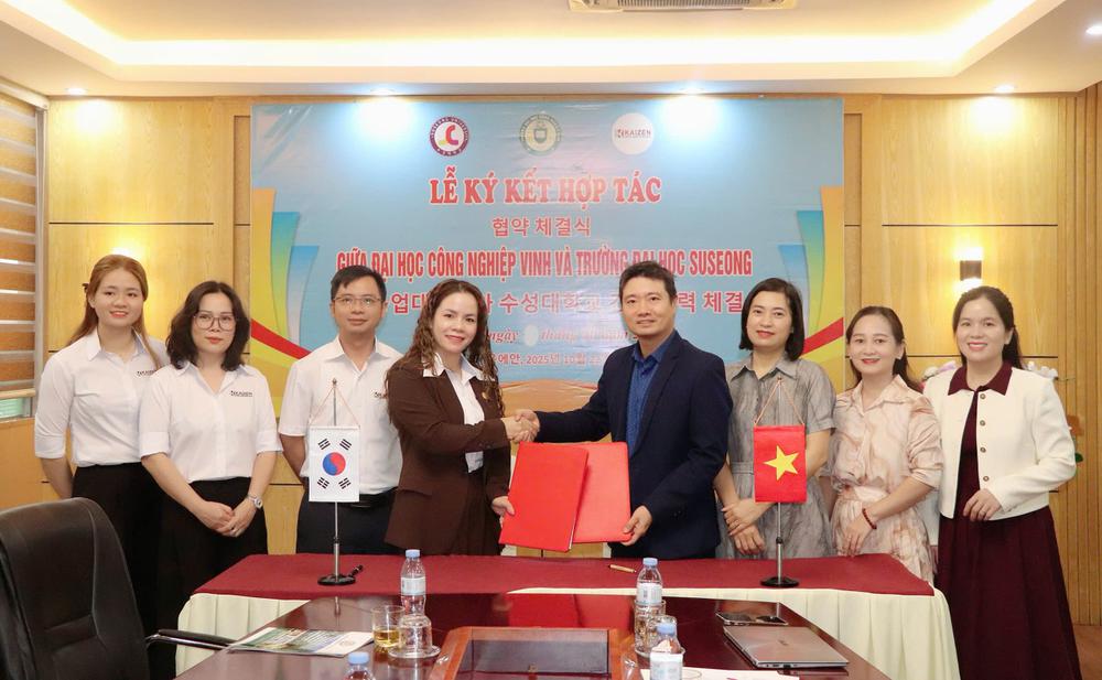 Ngày 25/10/2025, tại Trường Đại học Công nghiệp Vinh, đã diễn ra Lễ ký kết Biên bản ghi nhớ hợp tác giữa Trường Đại học Công nghiệp Vinh và Trường Đại học Suseong (Hàn Quốc), đồng thời ký Hợp đồng hợp tác chương trình du học Hàn Quốc hệ D2-6 với Công ty Cổ phần Nhân lực Quốc tế Kaizen.