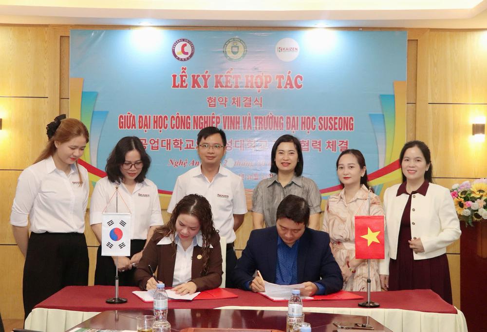 Cùng trong khuôn khổ buổi lễ, Trường Đại học Công nghiệp Vinh đã ký kết với Công ty CP Nhân lực Quốc tế Kaizen thống nhất hợp tác trong công tác tuyển sinh, đào tạo tiếng Hàn, tư vấn, hỗ trợ sinh viên làm hồ sơ, thủ tục visa và chăm lo đời sống sinh viên trong quá trình học tập tại Hàn Quốc.