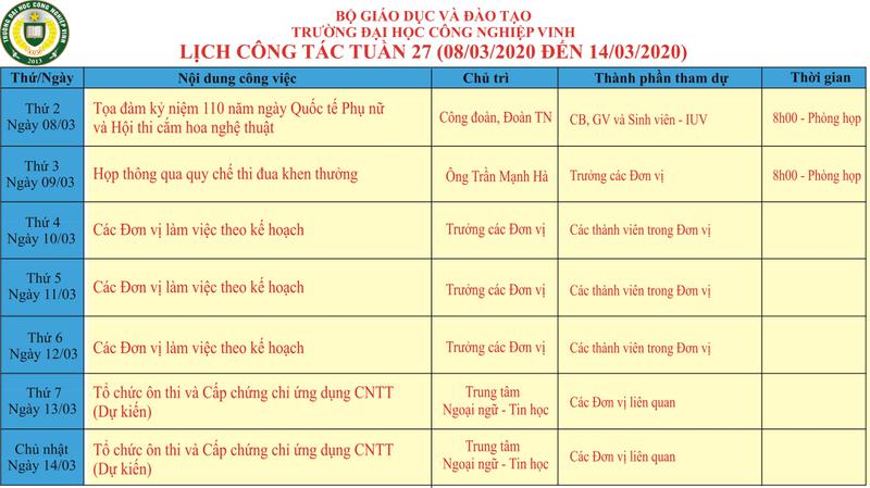 Lịch công tác tuần 27 năm học 2020 - 2021