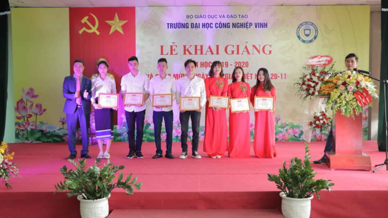 TS. Trần Mạnh Hà – Q. Hiệu trưởng Trường Đại học Công Nghiệp Vinh trao tặng học bổng cho sinh viên trong dịp khai giảng năm học mới 2019-2020 .