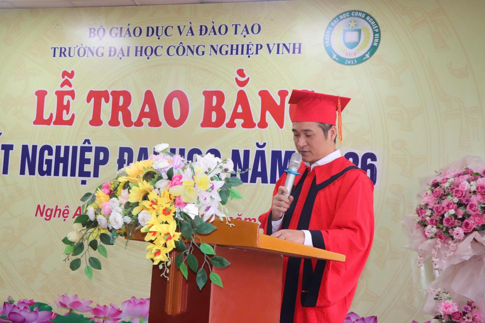 Đại diện các tân cử nhân, sinh viên Nguyễn Công Đạt – lớp K9DKTĐ đã phát biểu bày tỏ niềm xúc động và tự hào khi hoàn thành chặng đường học tập tại Trường Đại học Công nghiệp Vinh. Trong bài phát biểu, Nguyễn Công Đạt đã gửi lời tri ân sâu sắc tới Ban Giám hiệu, các thầy cô giáo, cán bộ, nhân viên Nhà trường cùng gia đình, người thân đã luôn đồng hành, hỗ trợ và tạo điều kiện để sinh viên hoàn thành chương trình học tập.